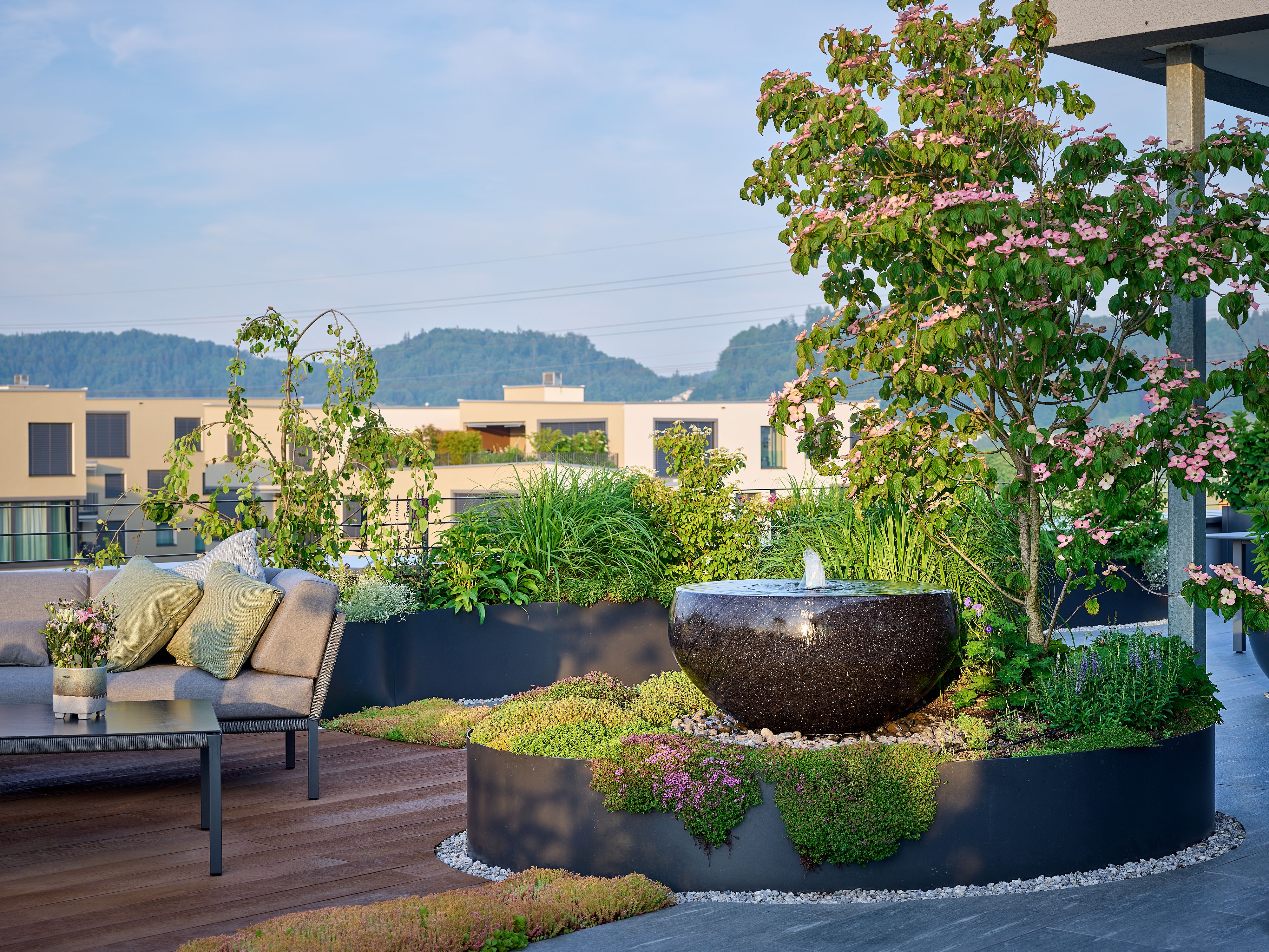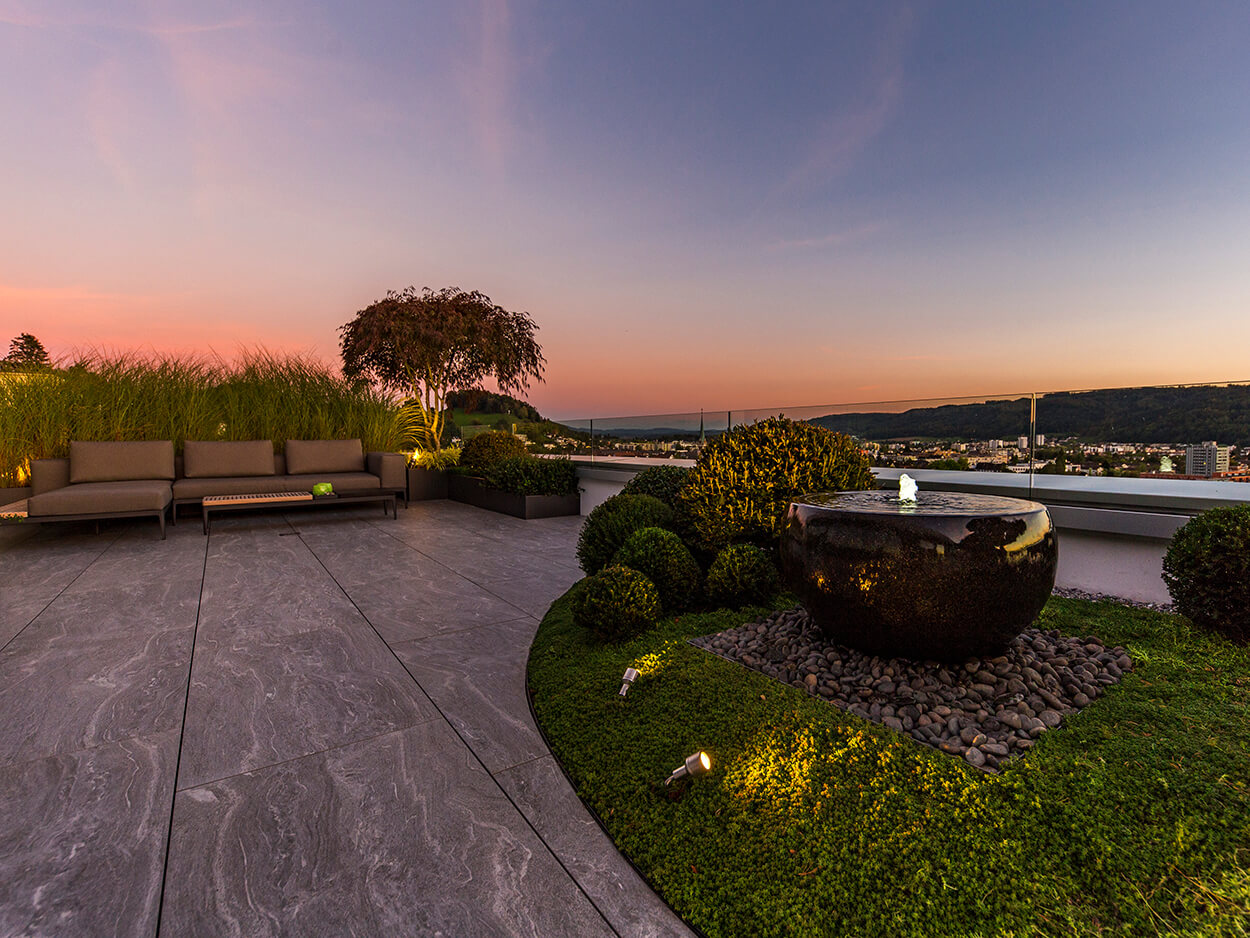 Auch auf Terrassen kommen die Schalen wirkungsvoll zur Geltung. Mit der richtigen Gewichtsverteilung lassen sich beeindruckende Akzente setzen. Das ruhige Plätschern, das Spiel des Lichts auf dem Wasser und die kraftvolle Präsenz des Steins verleihen jeder Schale eine fast skulpturale Wirkung.