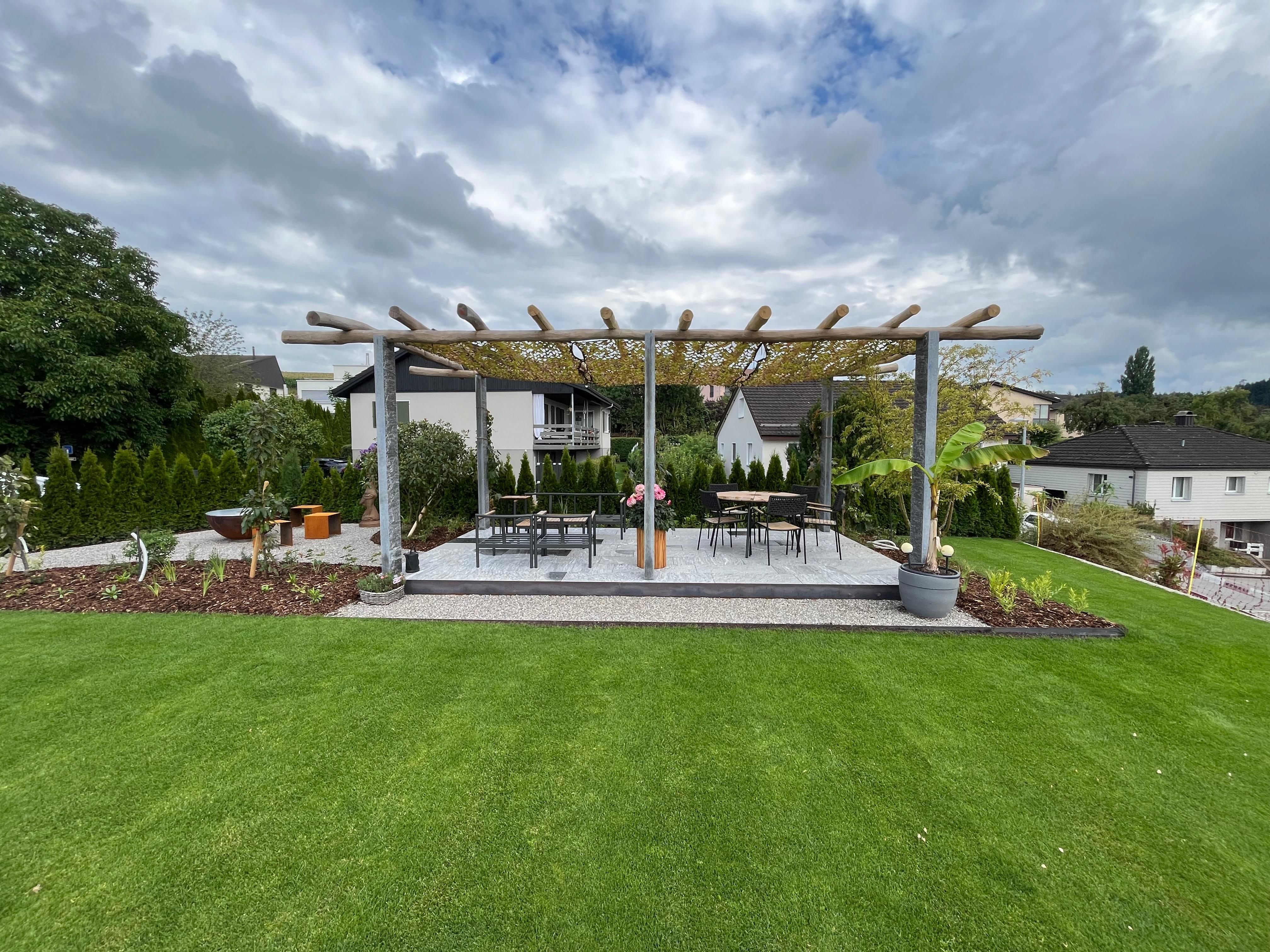 Eine Pergola mit Natursteinbelag und einer Bedachung aus Robinienholz, welches mit Kletterpflanzen bewachsen wird, bildet das Kernelement. Die vorgelagerte Kiesfläche lockert den Gartenbereich auf und bietet Platz für eine Feuerschale inklusive Hocker. Schattige Plätze für den Loungebereich, Grilladen auf der Feuerschale zubereiten oder einfach in einem Liegestuhl die Sonne geniessen? Kein Problem in diesem Pocketgarden. Ein Platz der zum verweilen und geniessen einlädt.