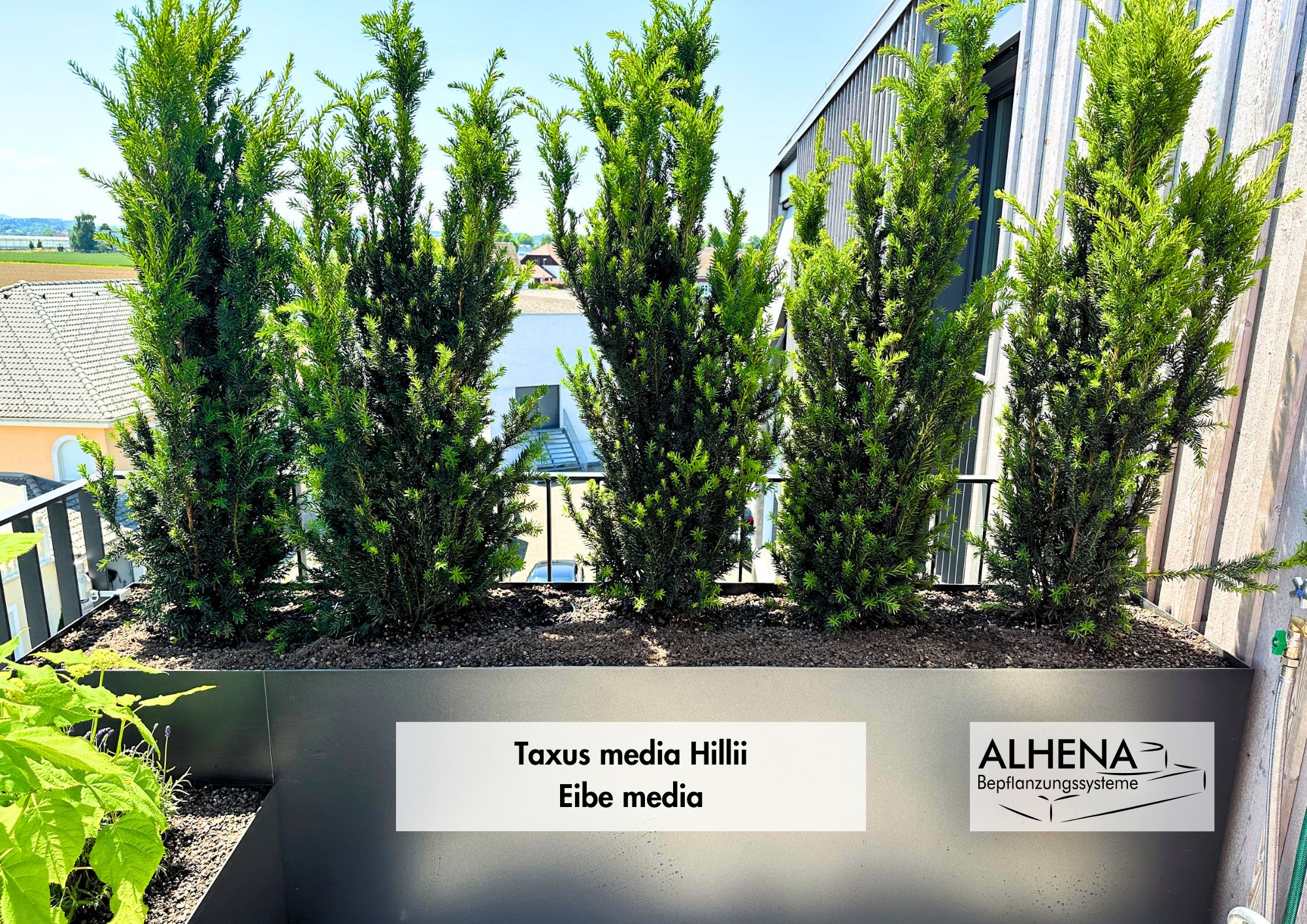 Taxus media ist sehr widerstandsfähig, schattenverträglich und kommt mit unterschiedlichen Standortbedingungen gut zurecht. In hochwertigen Pflanzsystemen zeigt sie zudem eine hohe Trockenheits- und Frosttoleranz, was sie zur idealen Wahl für exponierte Terrassenlagen macht.