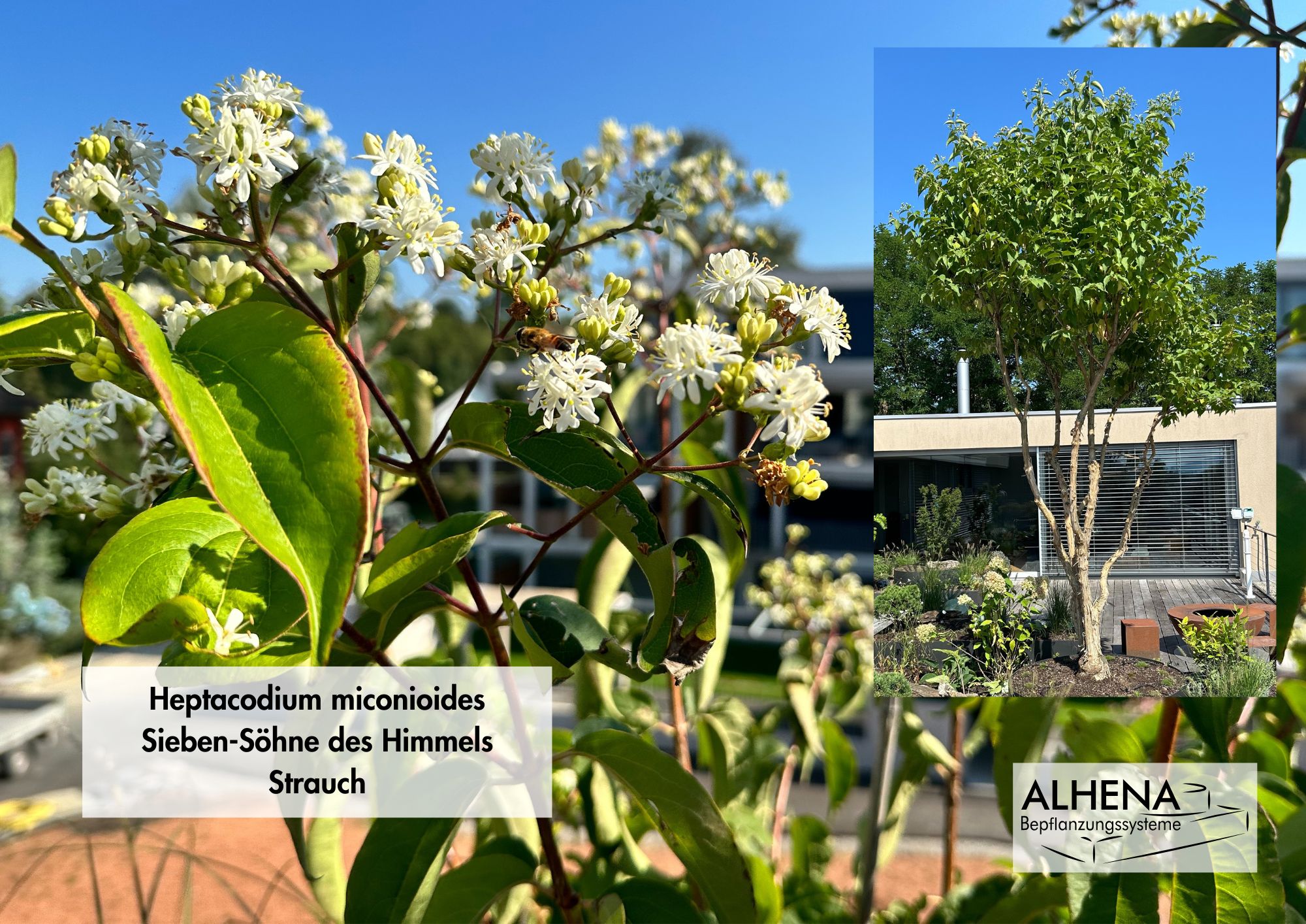 Besonders reizvoll ist seine späte Blütezeit: Während viele Gehölze bereits verblüht sind, zeigt Heptacodium im Spätsommer duftende, cremeweiße Blüten, die eine wertvolle Nahrungsquelle für Bienen und andere Insekten darstellen. Im Anschluss entwickeln sich dekorative, rötlich gefärbte Fruchtstände, die dem Baum bis in den Herbst hinein eine besondere Zierwirkung verleihen.