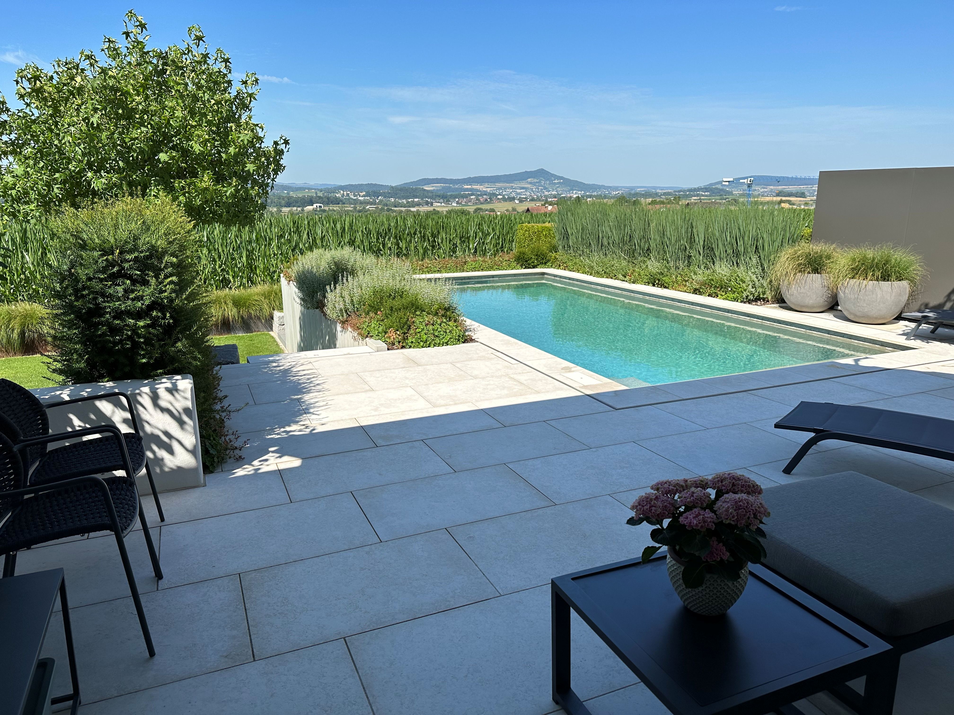 Um einen Umbau im Garten korrekt anzugehen, braucht es immer eine Planung der Bauten und Bepflanzungen. Im Vorfeld werden die Höhen und die genauen Ausmasse digital erfasst. Dann kommt unsere Gartenplanerin zum Einsatz: In Absprache wird ein Entwurf erarbeitet, der ein genaues Bild des zukünftigen Gartens aufzeigt. Mit diesem Vorgehen wird ein genaues Angebot erstellt, das zu keinen Unvorhersehbarkeiten für den Bauherrn führt. Vor der Ausführung des Gartens werden durch unseren technischen Zeichner die Ausführungspläne erstellt. Diese sind die Voraussetzung für die Gartenbau-Equipen, die dann wissen, wo was gebaut wird: Fundationsschichten, Leitungen und – sehr wichtig – die Entwässerung der gesamten Anlage. Dieser Punkt wird mit dem heutigen Starkregen immer wichtiger, da niemand eine Überschwemmung im Garten riskieren will.