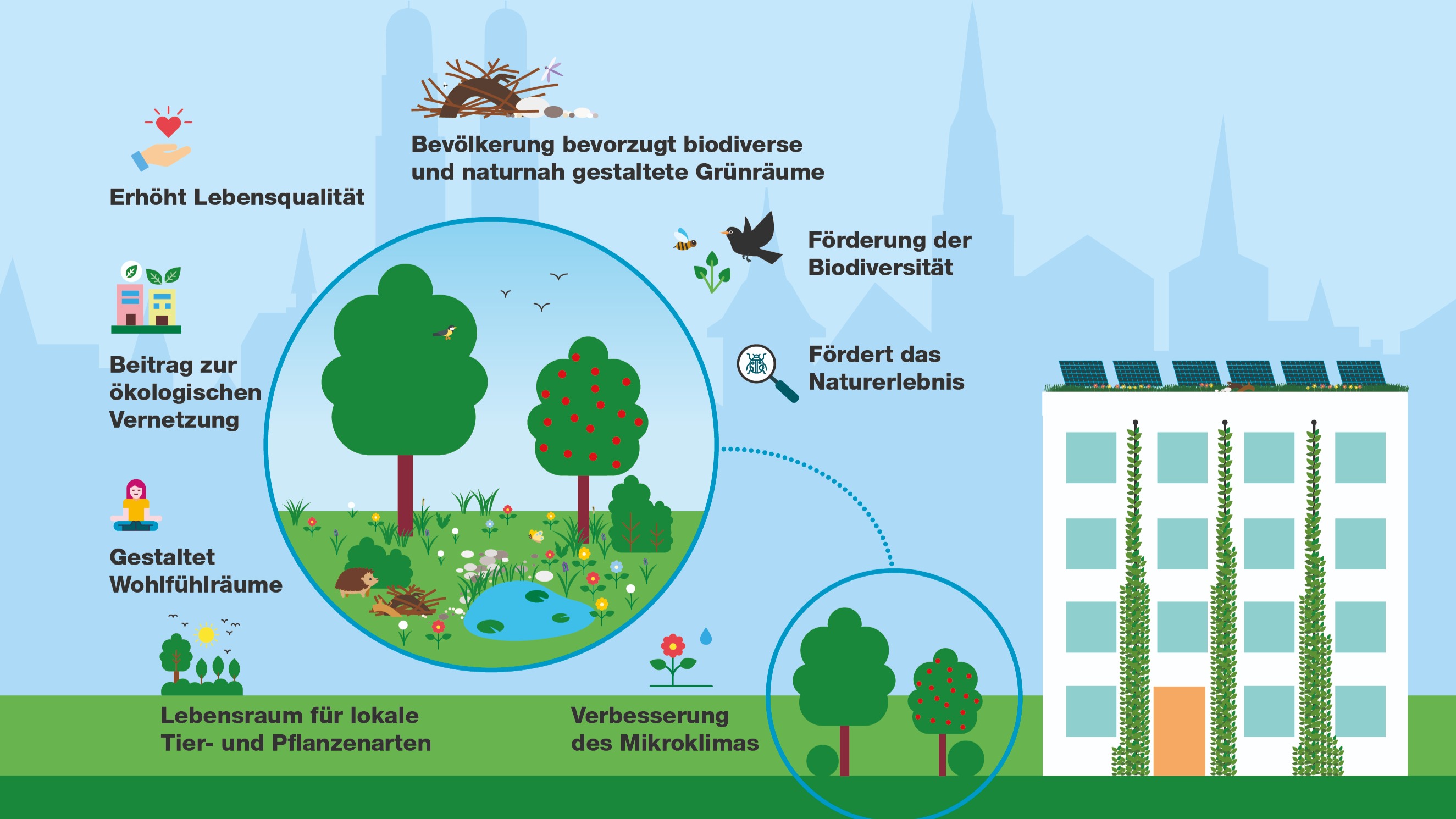 Grünflächen und Gärten schaffen wichtige Lebensräume für Pflanzen und Tiere und fördern so die Artenvielfalt in der Stadt. Jeder unversiegelte Boden und jeder vernetzte Grünraum leistet einen wertvollen Beitrag zu einer lebendigen, urbanen Natur.