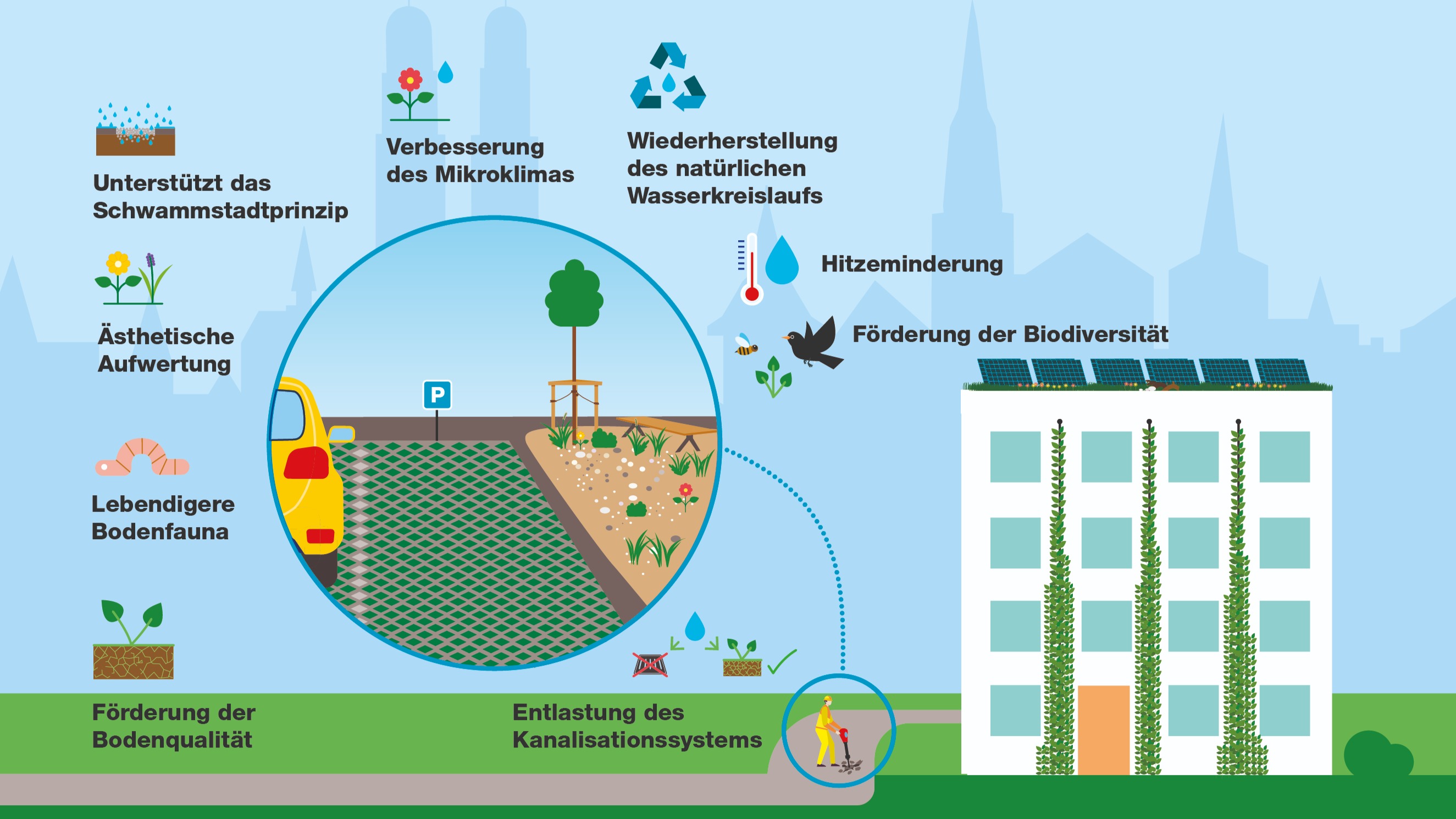 Durch die Umwandlung versiegelter Flächen in Grünflächen wird der Boden wieder wasserdurchlässig. Dies verringert Überhitzung und Hochwasserrisiken und fördert die Rückkehr natürlicher Lebensräume. Das Förderprogramm Stadtgrün fördert die Entsiegelung von versiegelten Flächen im Bestand bei privaten Eigentümerschaften.