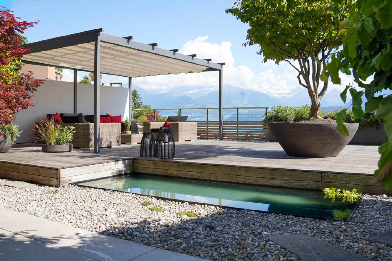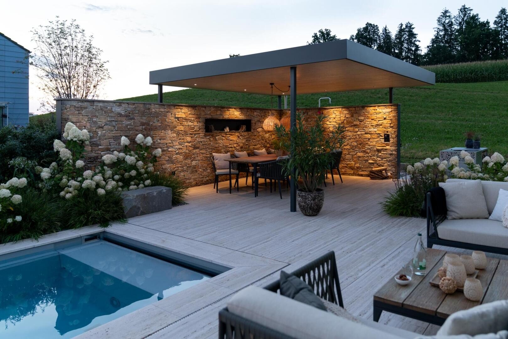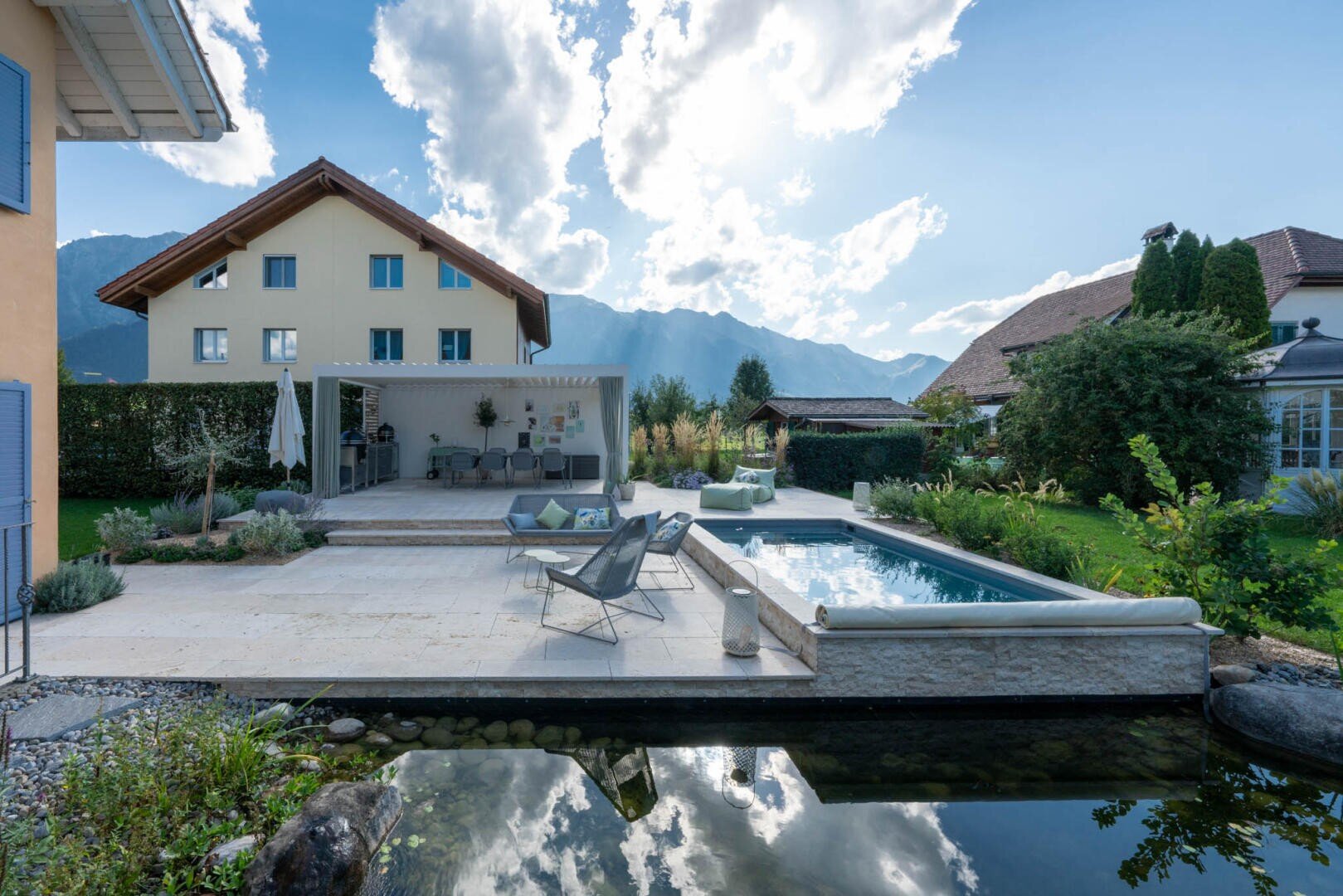 Endergebnis Wassergarten mit Pergola und Aussenküche