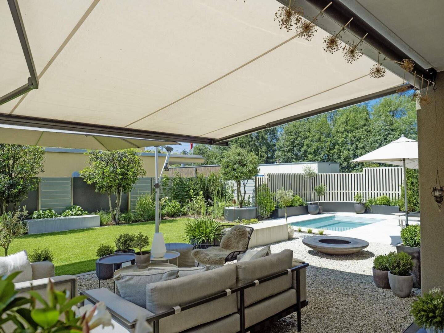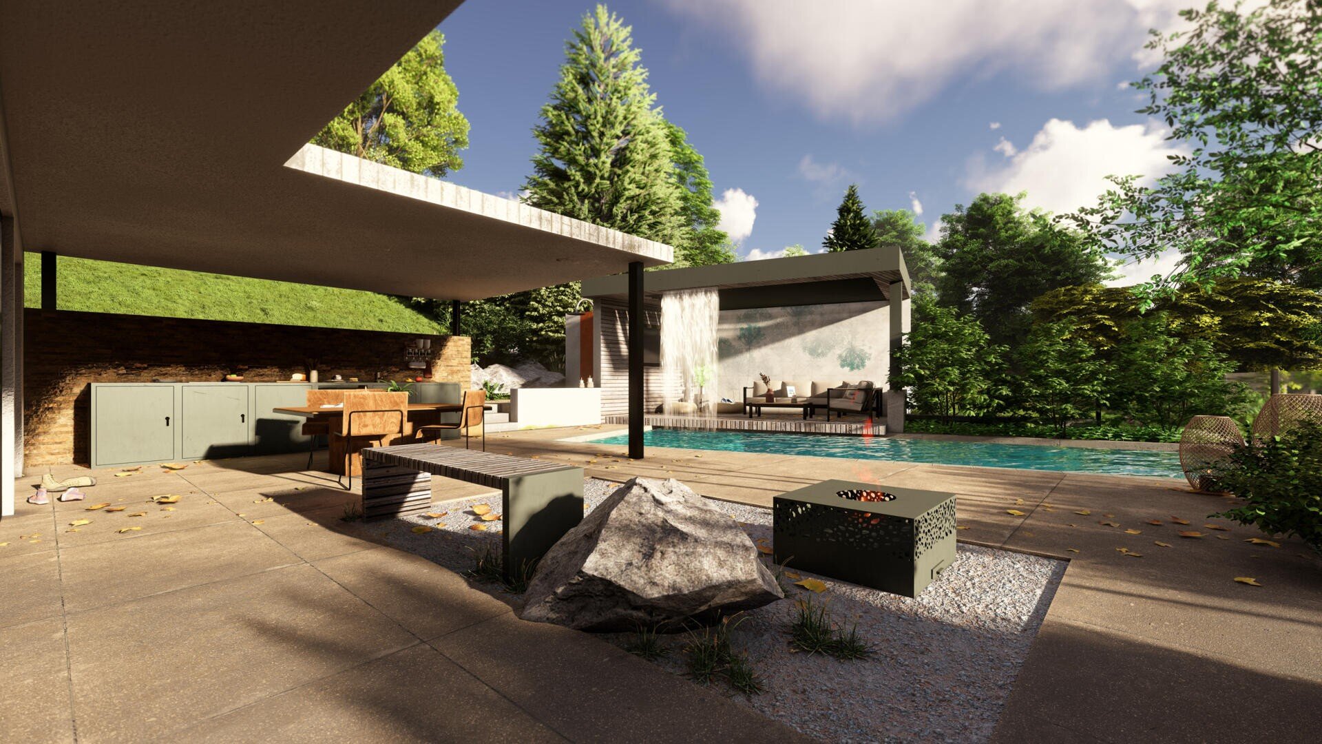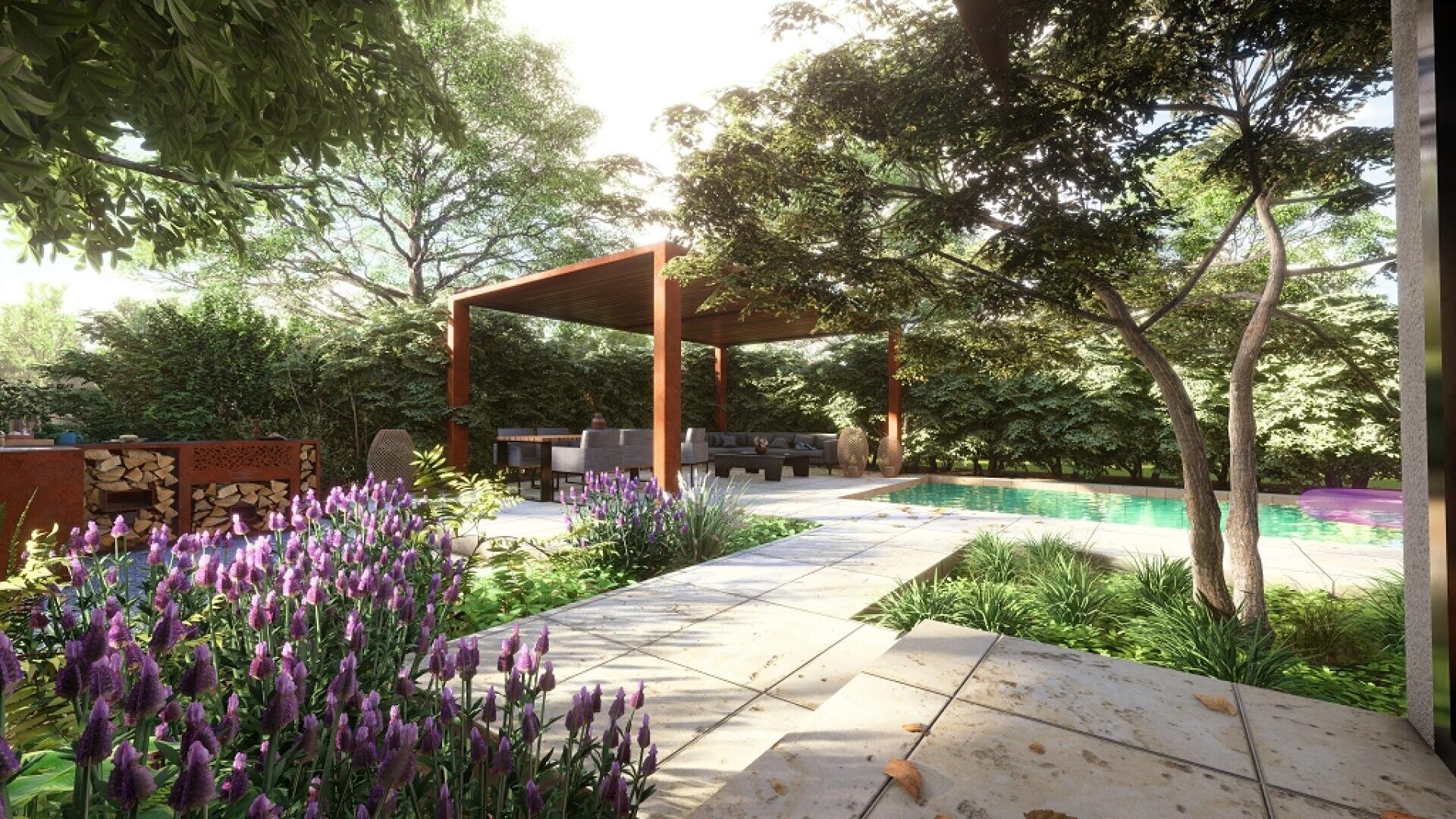 Endergebnis Wassergarten mit Pergola und Aussenküche