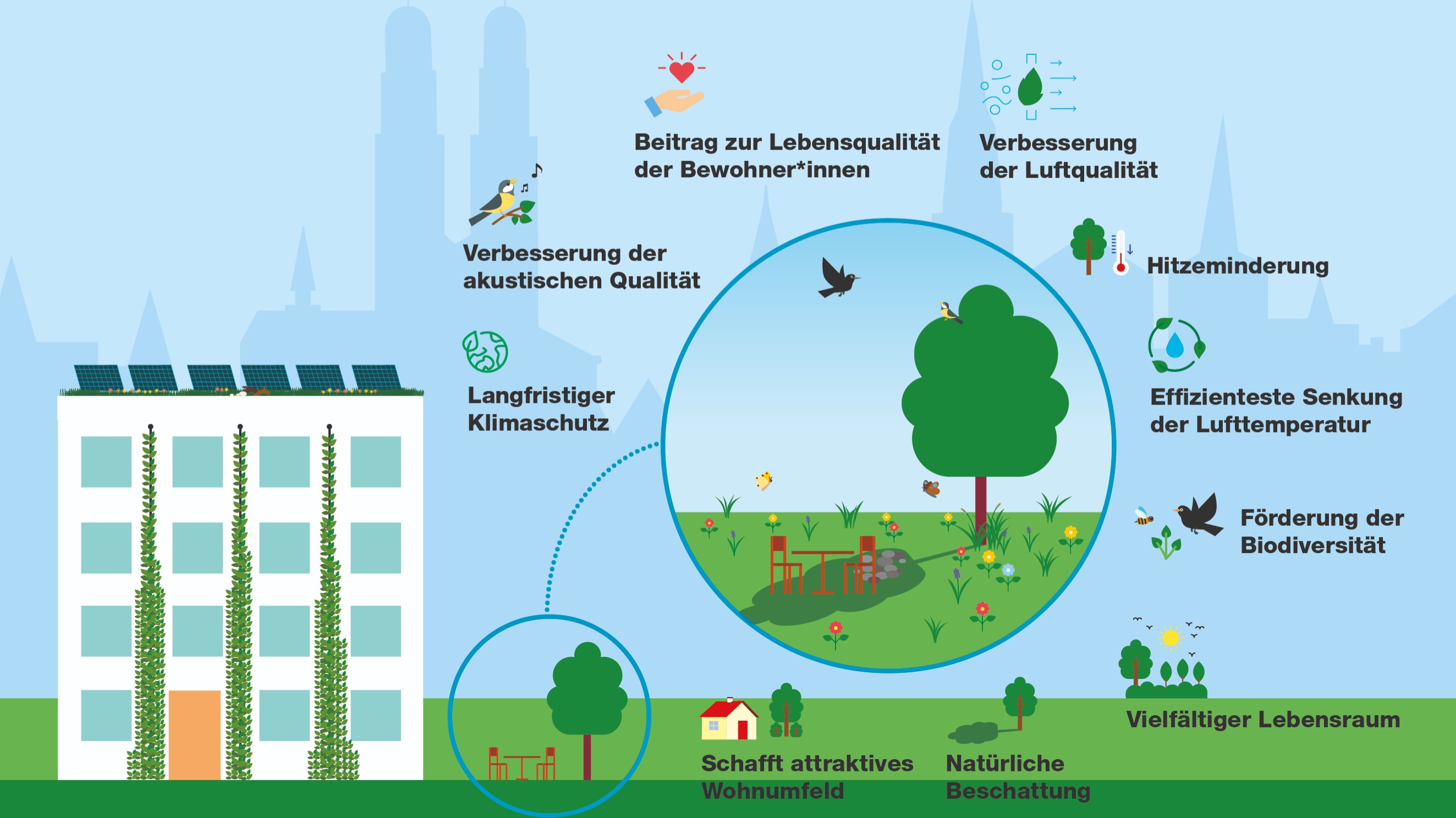 Im Programm Stadtgrün der Stadt Zürich werden Massnahmen zur Hitzeminderung, Klimaverbesserung und zur Steigerung der Biodiversität bis 2035 umgesetzt. Auch Private können einen Beitrag leisten und dafür Beratung und finanzielle Beiträge erhalten.