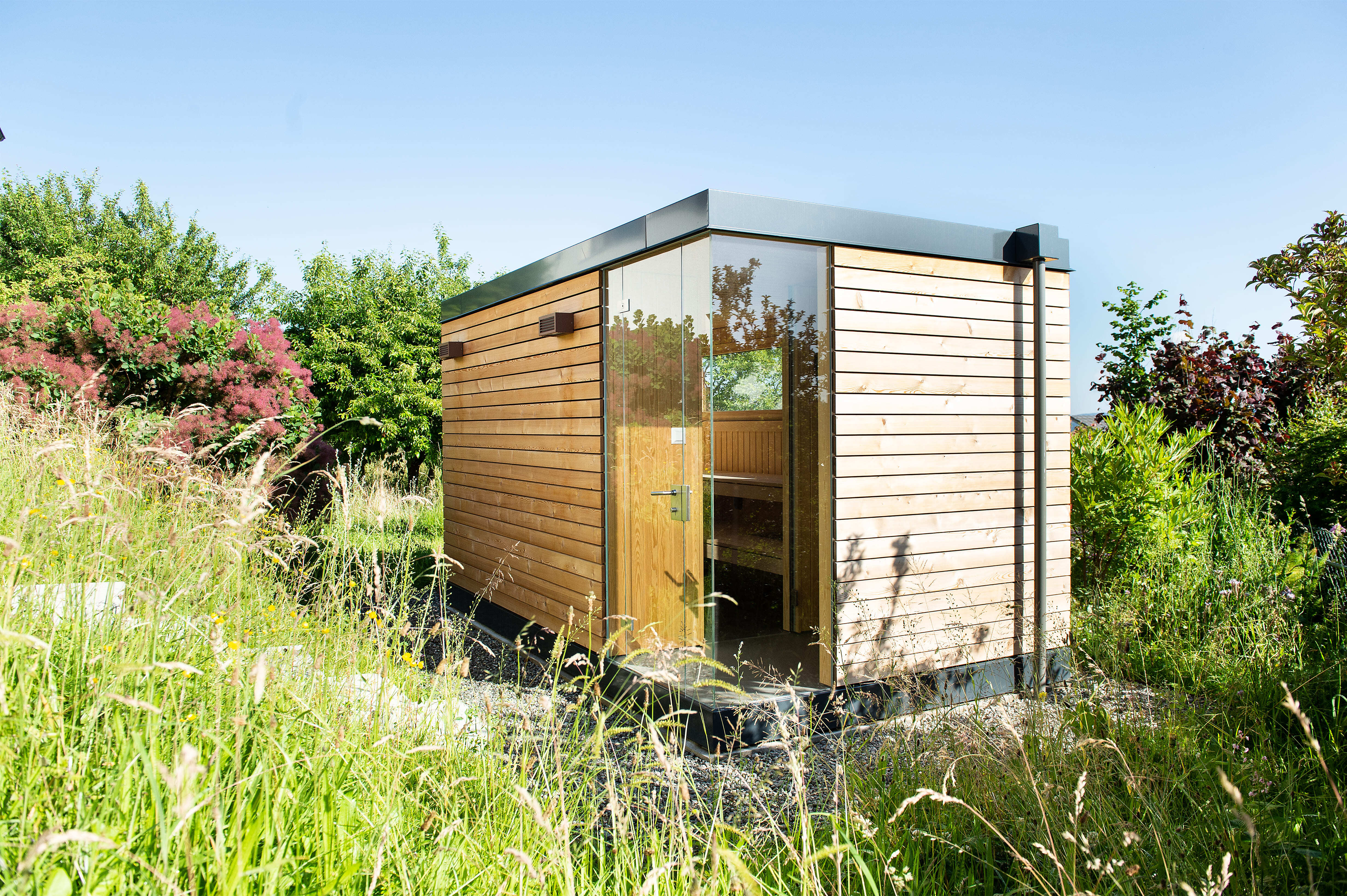 Erleben Sie mit der Nido Outdoor Sauna von Küng Wellness pure Natur-Wellness im eigenen Garten. Modular, mit grossen Panoramafenstern und vielseitig erweiterbar – für einzigartige Entspannung in Ihrem Aussenbereich.