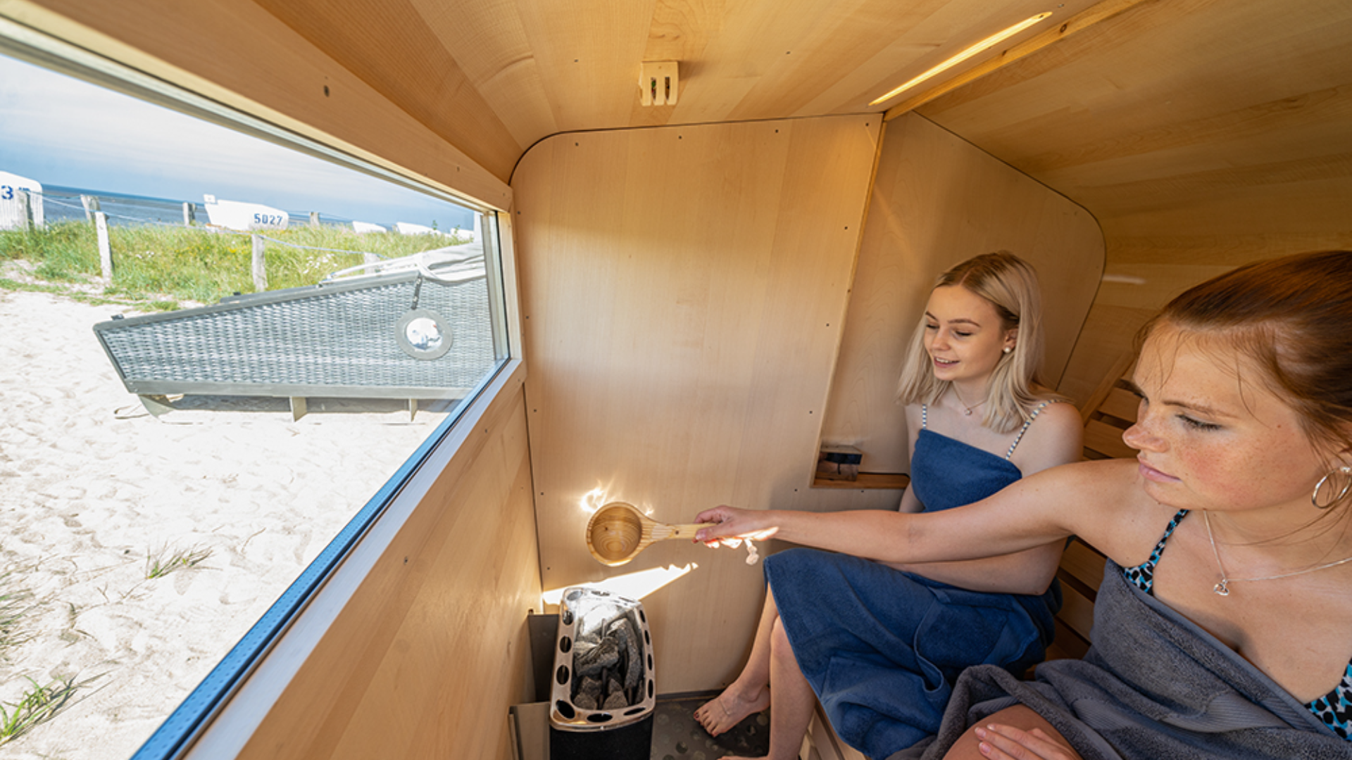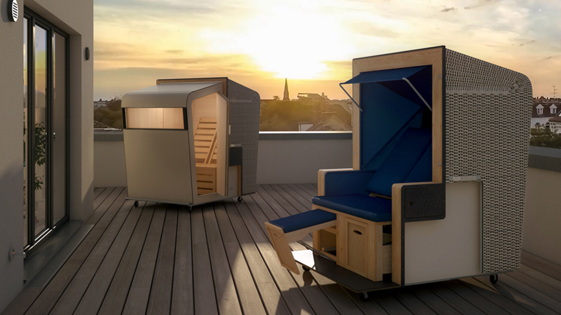 Das Wellness-Doppel der Korbsauna beruht auf einem einfachen Prinzip. Geöffnet ist sie ein Strandkorb, geschlossen eine Sauna. Das ist in dieser Form einzigartig.