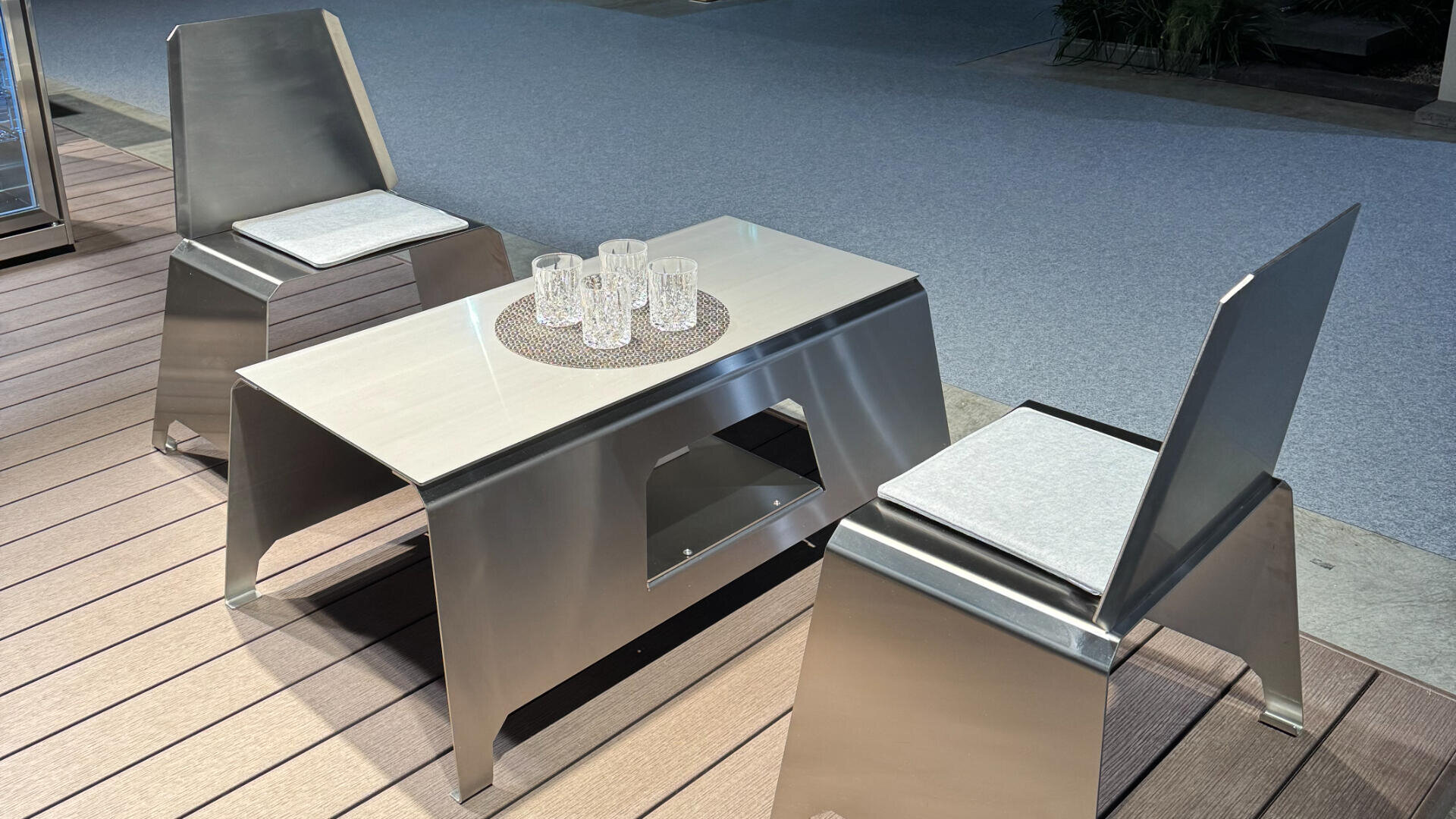 Wir präsentieren stolz zwei exklusive Neuheiten der Momentum Line: einen stilvollen Loungetisch mit passendem Hocker sowie einen eleganten Sichtschutz aus hochwertigem Edelstahl.