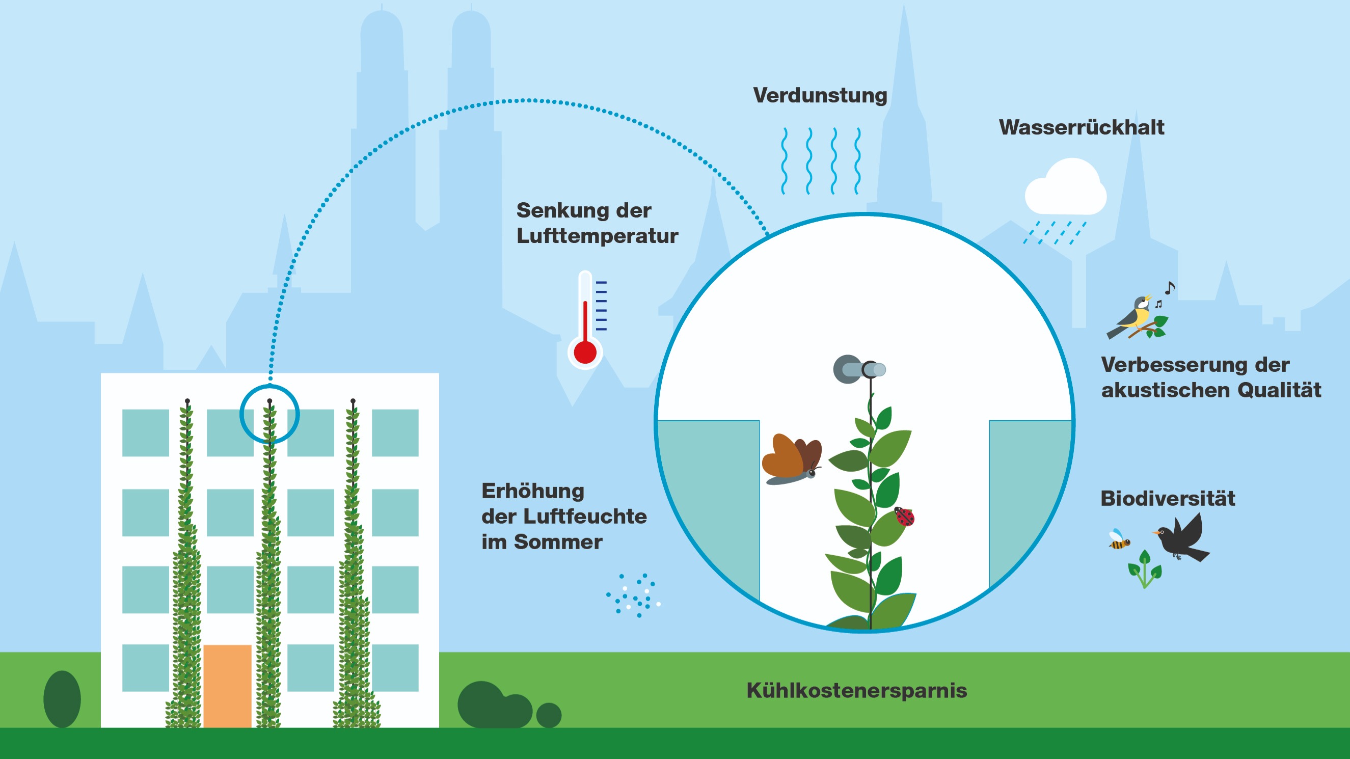 Begrünte Flachdächer, Fassaden und andere vertikale Flächen tragen zur Kühlung bei. Diese Flächen bringen das Grün mitten in die Stadt und sorgen für frische Luft – auch in dicht bebauten Gebieten.