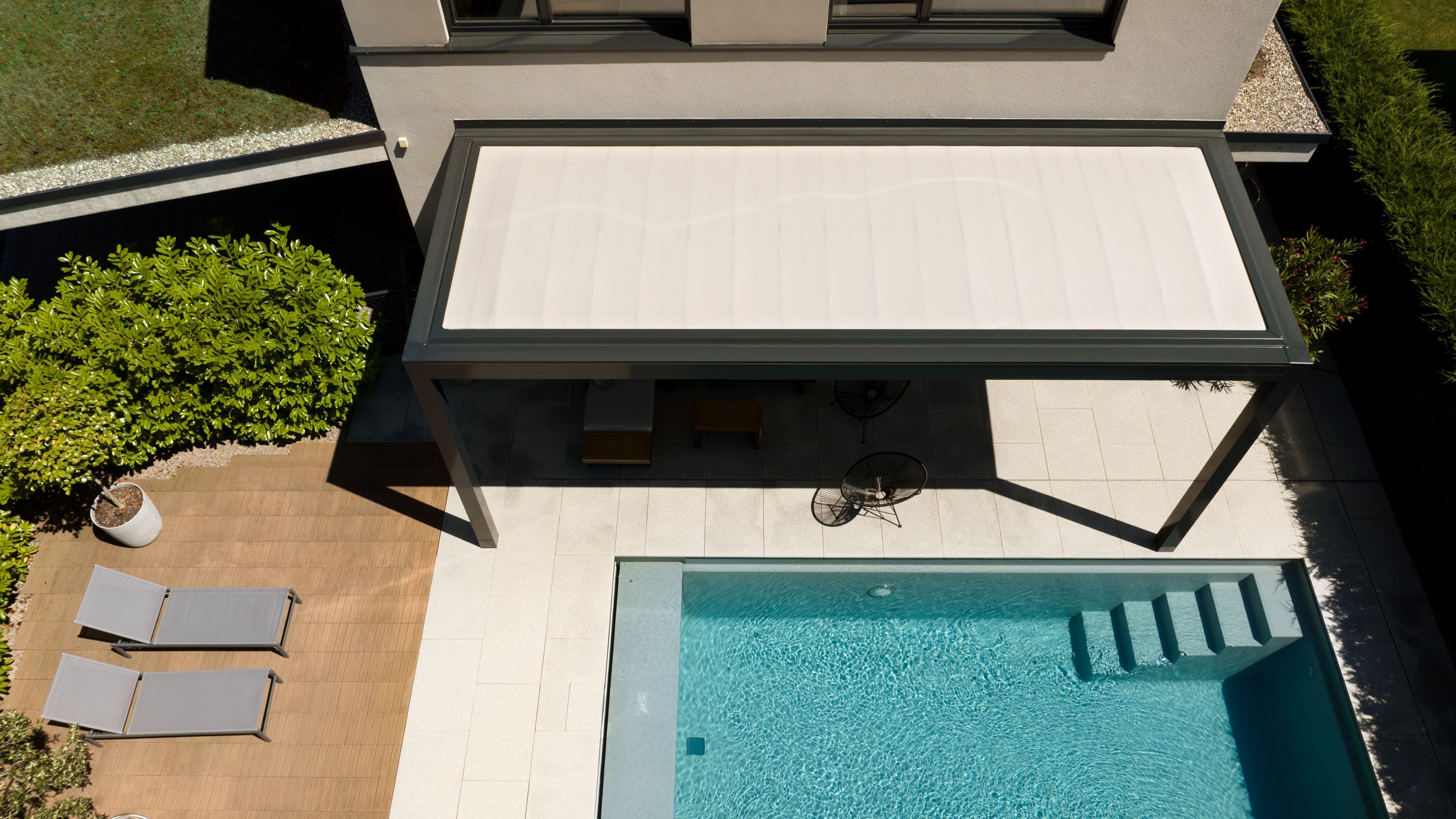 The owners have added an inviting lounge area on the sun-exposed south-west side of their modern single-family home. It looks directly over the water of the adjoining swimming pool. Because they enjoy spending time in the seating area, the family decided to install a sturdy, permanent roof solution that they could open and close depending on the weather, or even leave open for longer periods.