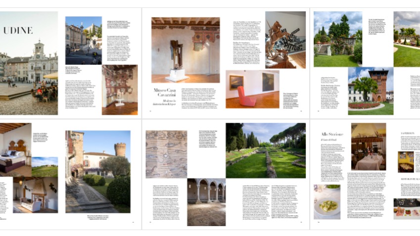 This journey through Friuli takes you from mighty trees and historic towns to gardens full of poetry and places of pleasure and art. Udine shows its Venetian face and Friulian heart, accompanied by fine culinary addresses and modern art. In Cividale, Aquileia and Palmanova, legends, antiquity and the living present meet. Castles, abbeys and villas tell of culture, landscape and lifestyle, while rose gardens and special parks open up quiet spaces of memory and beauty. Spilimbergo and Verzegnis bridge the gap to art, Pordenone and Sacile to urban joie de vivre. Authentic osterias, regional specialities and Friulian recipes round off the experience – an invitation to discover Friuli with all your senses.