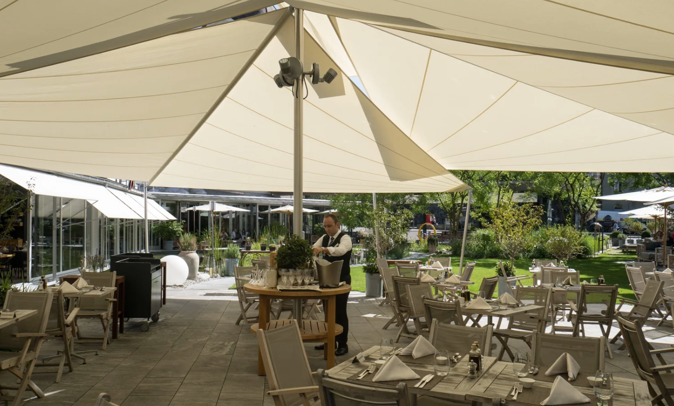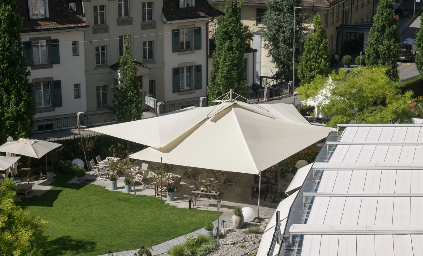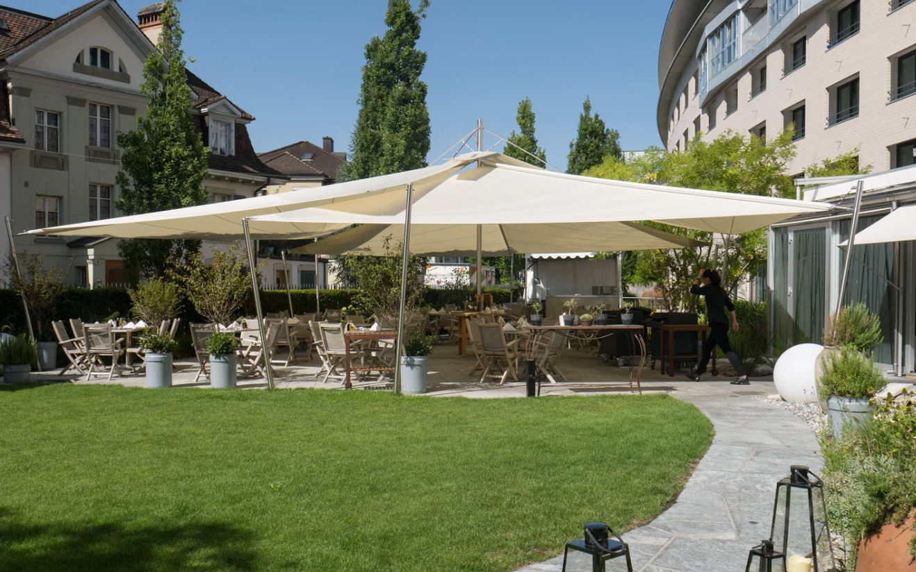 The Kursaal Bern, the renowned congress and event center in the heart of the capital, uses an electrically retractable awning - a solution from Swiss Sonnensegel or comparable systems. Thanks to the automated awning, events on the roof terrace are equally protected in sun and rain. This ensures reliable comfort even in changeable weather - ideal for rooftop sessions and barbecue events above the rooftops of Bern.
