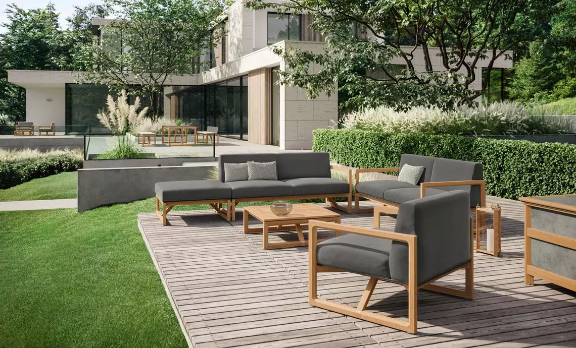 The Trey collection from Garpa combines modern design with high functionality. Made from high-quality teak and robust synthetic resin panels, the furniture is both visually appealing and particularly durable.